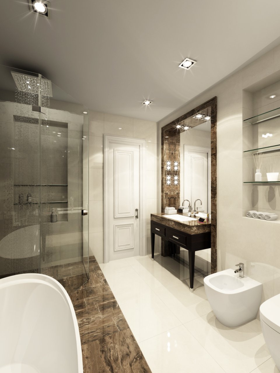 Просторная ванная комната светла, уютна и графична, а глубокая ванна потрясающе выглядит на фоне коричневого мрамора.
