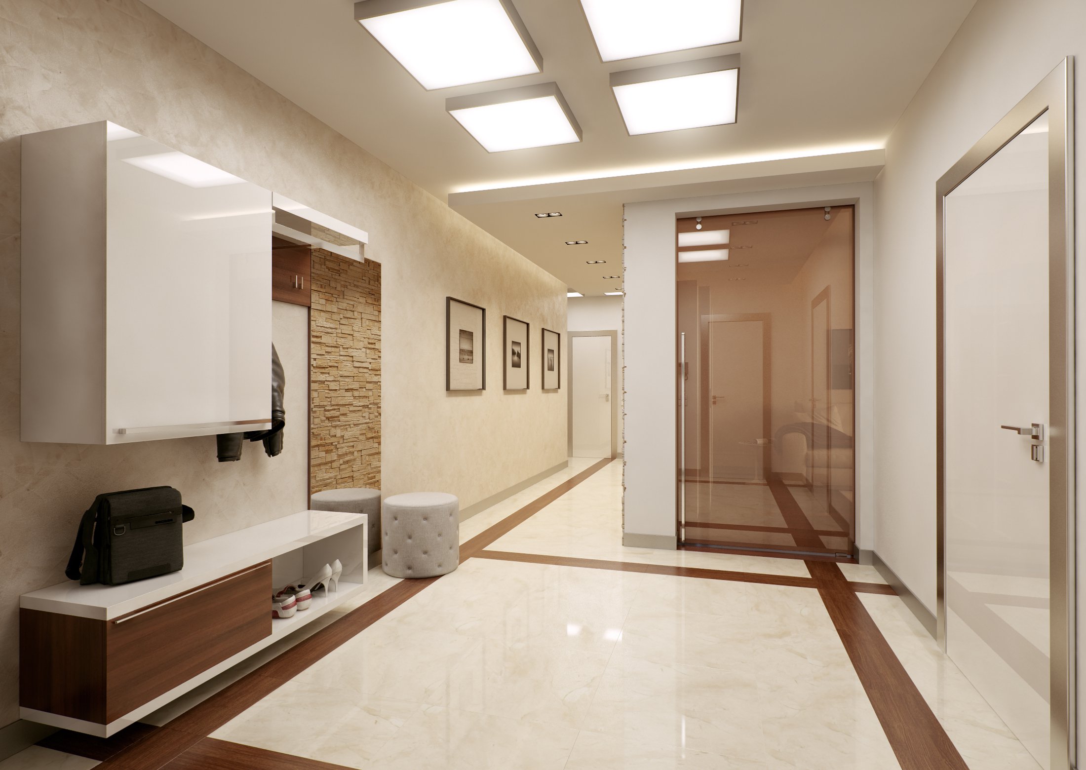 В отделке части стен холла и кухни использован камень. Его природная грубоватая фактура контрастирует правильностью линий и гладкостью полированных поверхностей. Такая отделка стен придает помещению оригинальность.