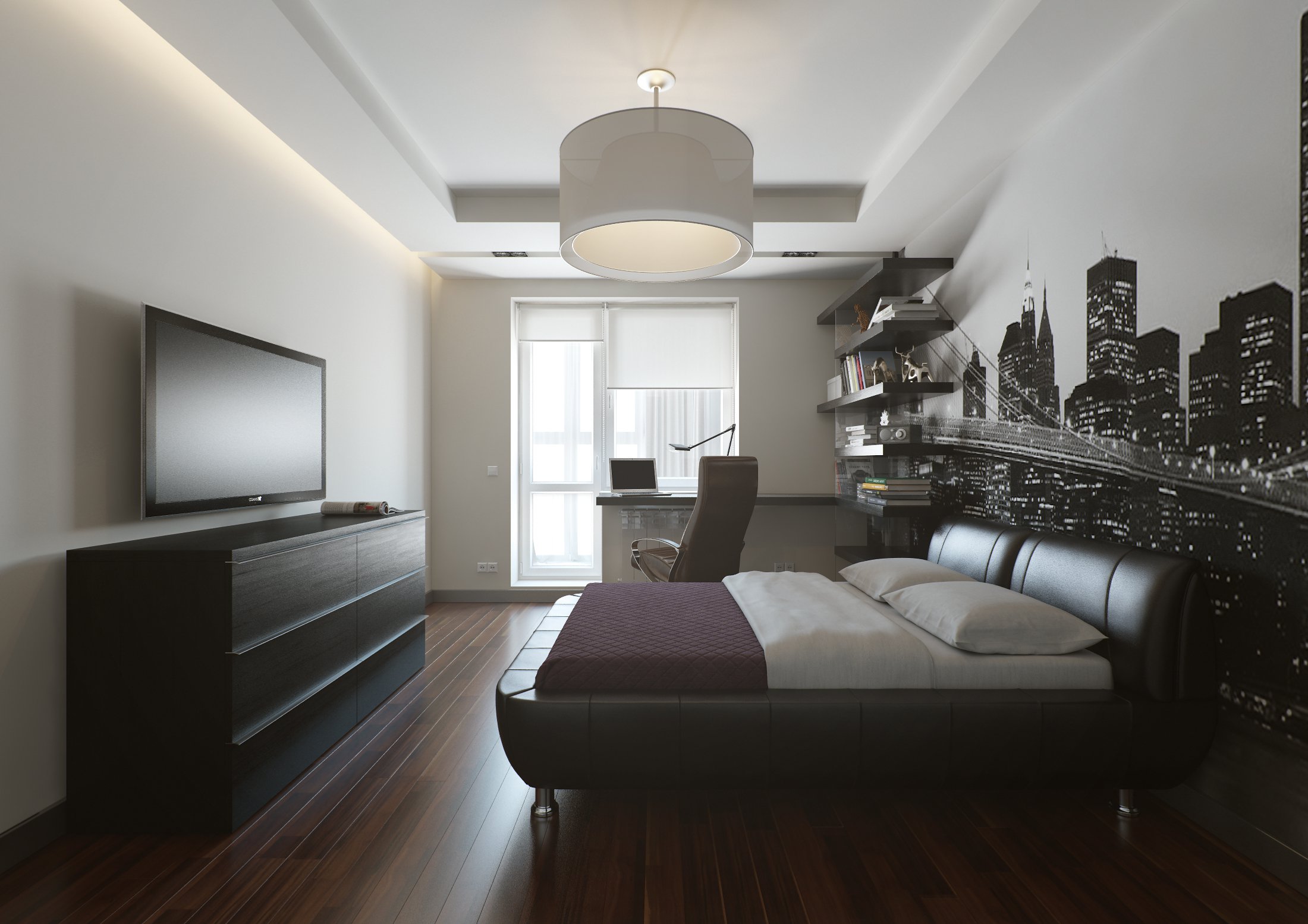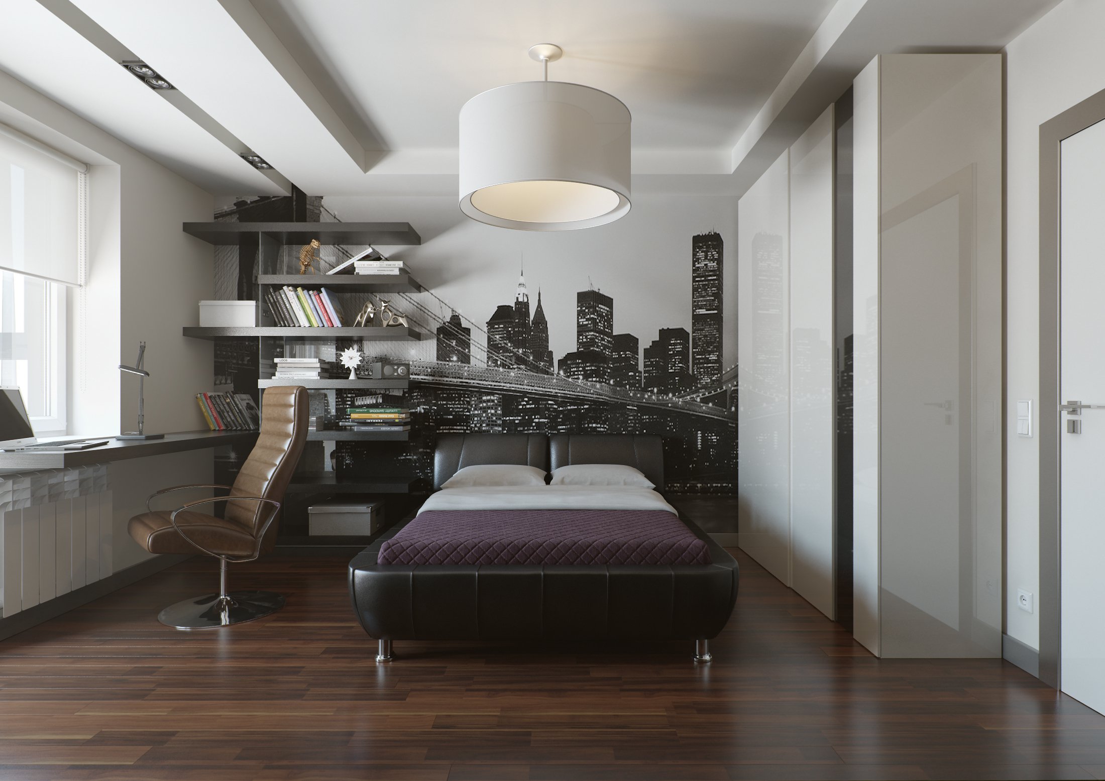 Силуэт ночного города на стене подчеркивает и дополняет контрастность черно-белого дизайна комнаты подростка.