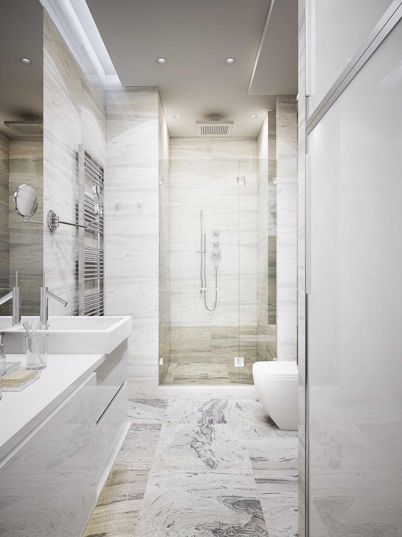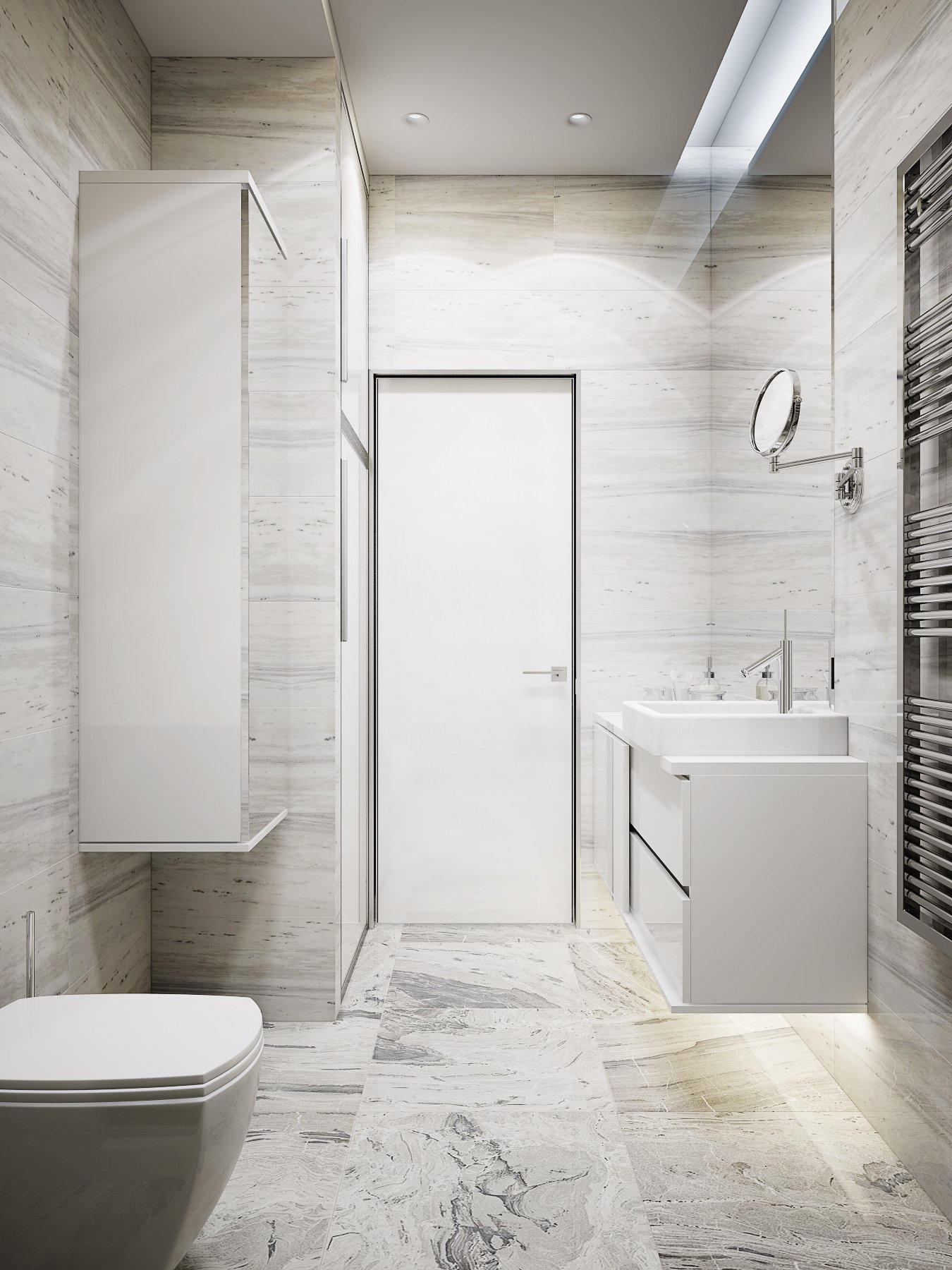 Гостевой санузел — необходимая составляющая квартиры, в которой ванная комната доступна только из мастер-спальни. Помещение достаточно просторно, чтобы вместить душевую кабину, шкаф для хранения косметики и бытовой химии. В колонне у входа скрывается стиральная машина.