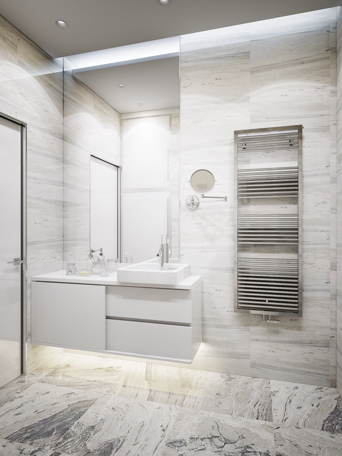 Ванная комната занимает прямоугольное пространство, соразмерное глубине спальни. Узкая тумба, поставленная перпендикулярно стене, зонирует помещение и скрывает наиболее интимную часть санузла. Помимо ванной предусмотрена душевая.