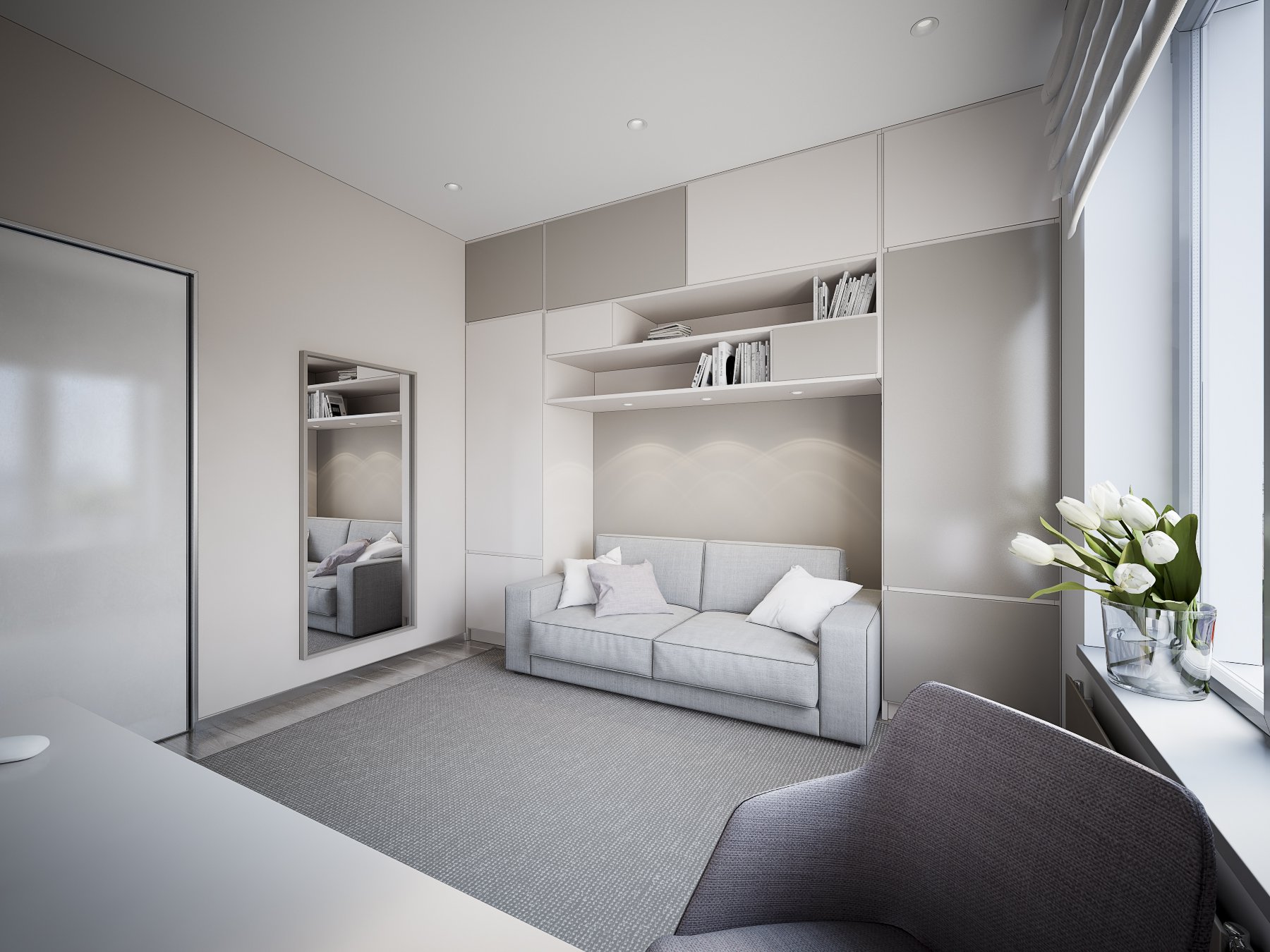 Две комнаты в квартире примут нужную функцию в зависимости от потребностей жильцов. Обе комнаты решены в нейтральном стиле, а обставлены так, что могут быть приспособлены под разные нужды — гостевой спальни, кабинета, детской, комнаты подростка, мастерской. В каждой из комнат предусмотрены спальные места, место для работы и вместительные системы хранения.