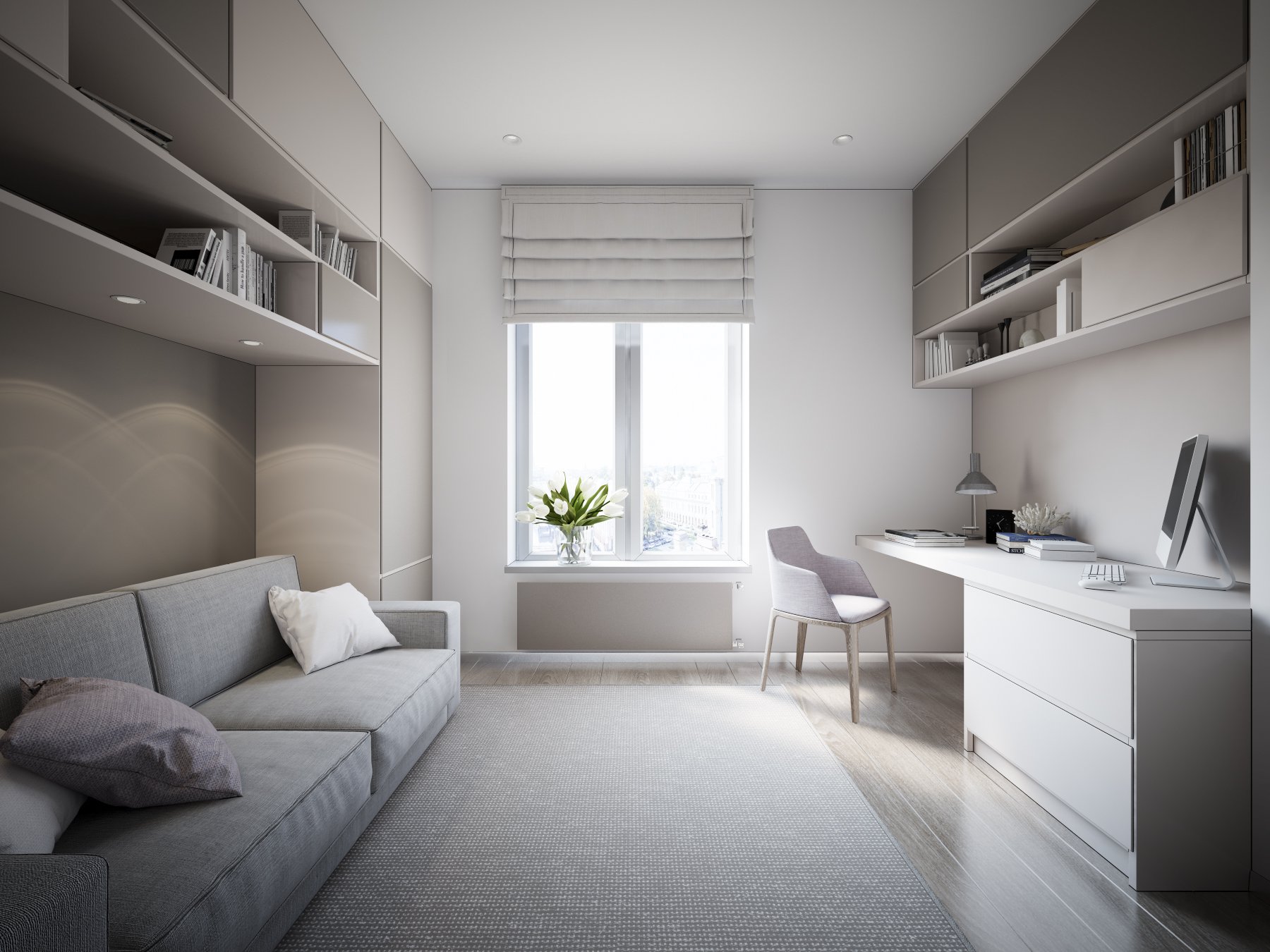 Две комнаты в квартире примут нужную функцию в зависимости от потребностей жильцов. Обе комнаты решены в нейтральном стиле и обставлены так, что могут быть приспособлены под разные нужды — гостевой спальни, кабинета, детской, комнаты подростка, мастерской.