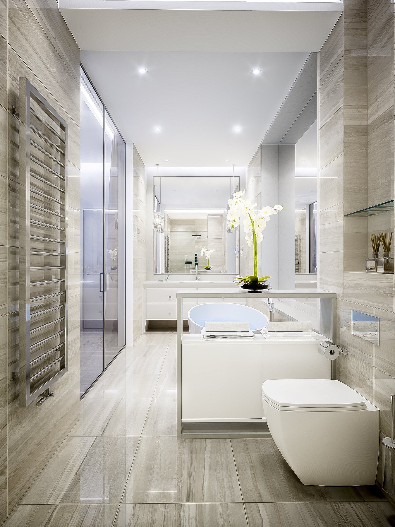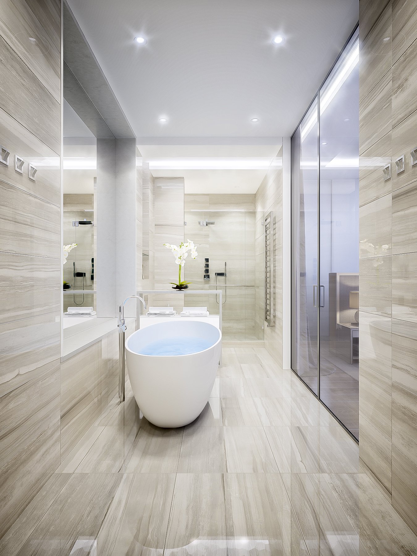 Ванная комната занимает прямоугольное пространство, соразмерное глубине спальни. Отдельно стоящая ванная располагается посередине, напротив стеклянных дверей в комнату. Узкая тумба, поставленная перпендикулярно стене, зонирует помещение и скрывает наиболее интимную часть санузла. Помимо ванной предусмотрена душевая.