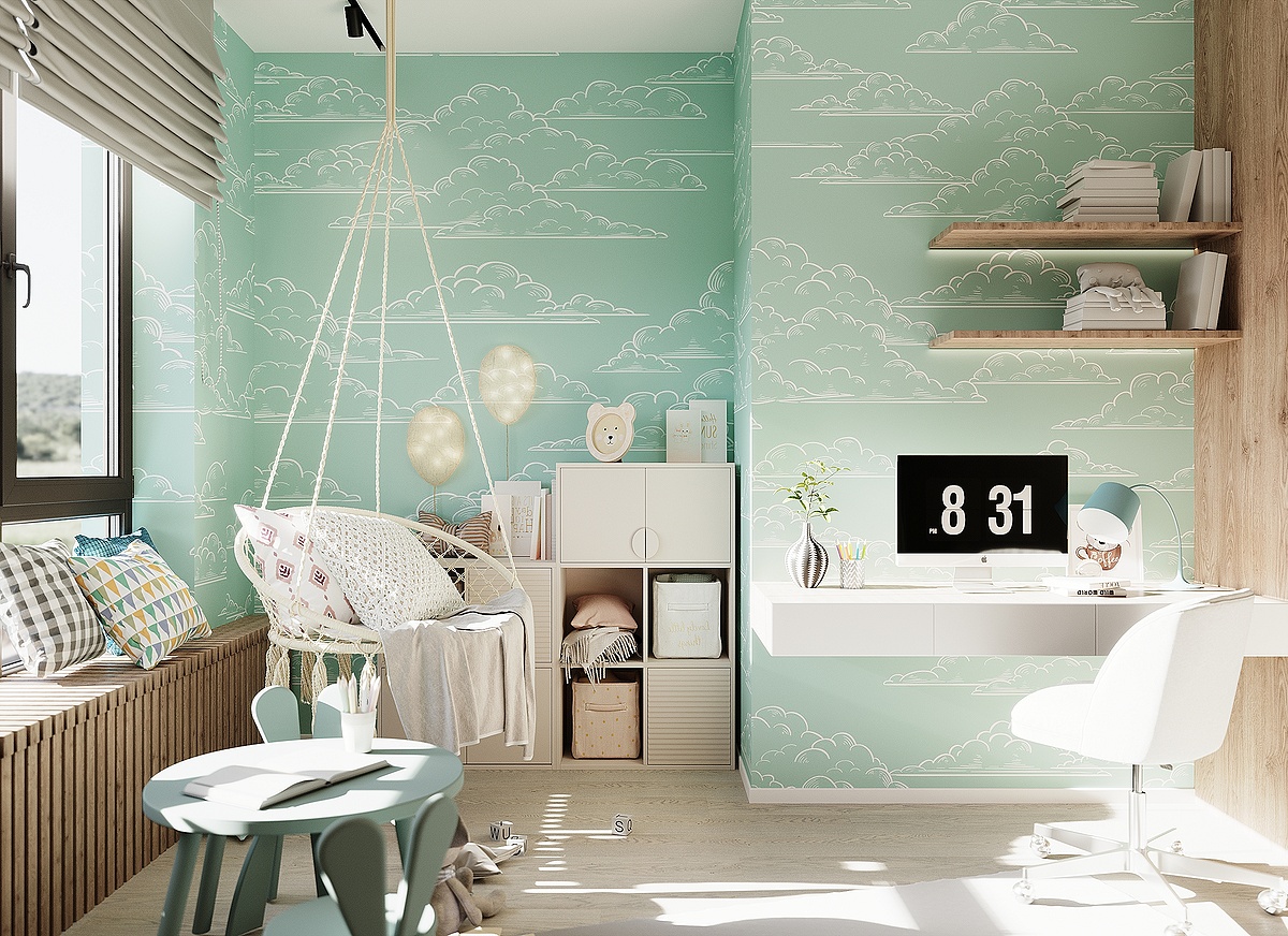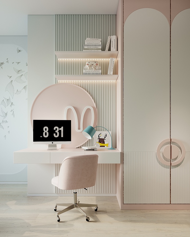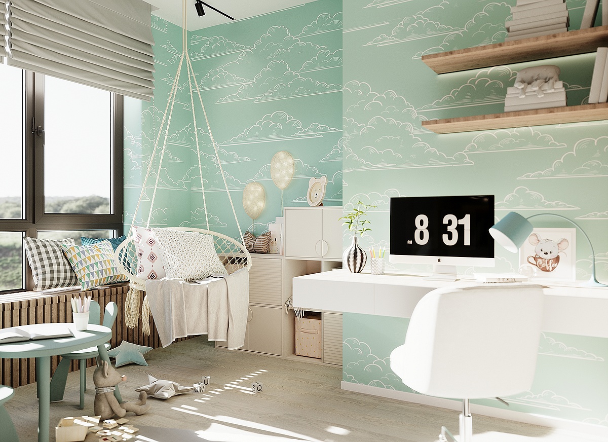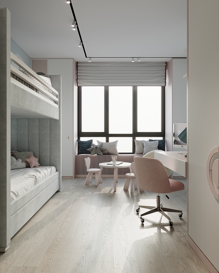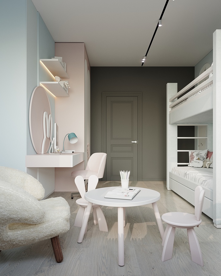 В рамках проекта было разработано несколько вариантов интерьера. Например, первоначальный вариант детской комнаты был оформлен в более светлых оттенках и имел меньше мест хранения.