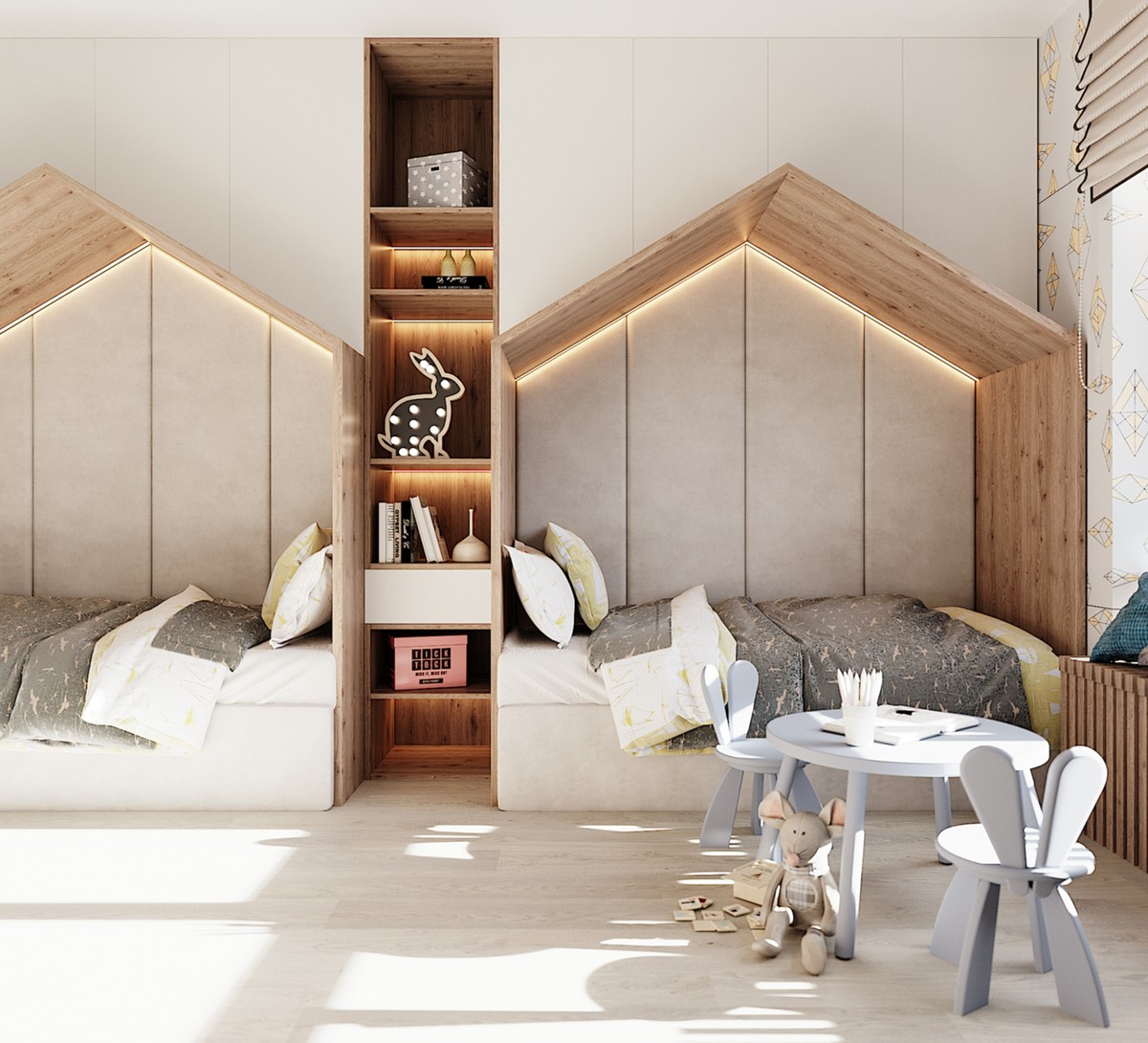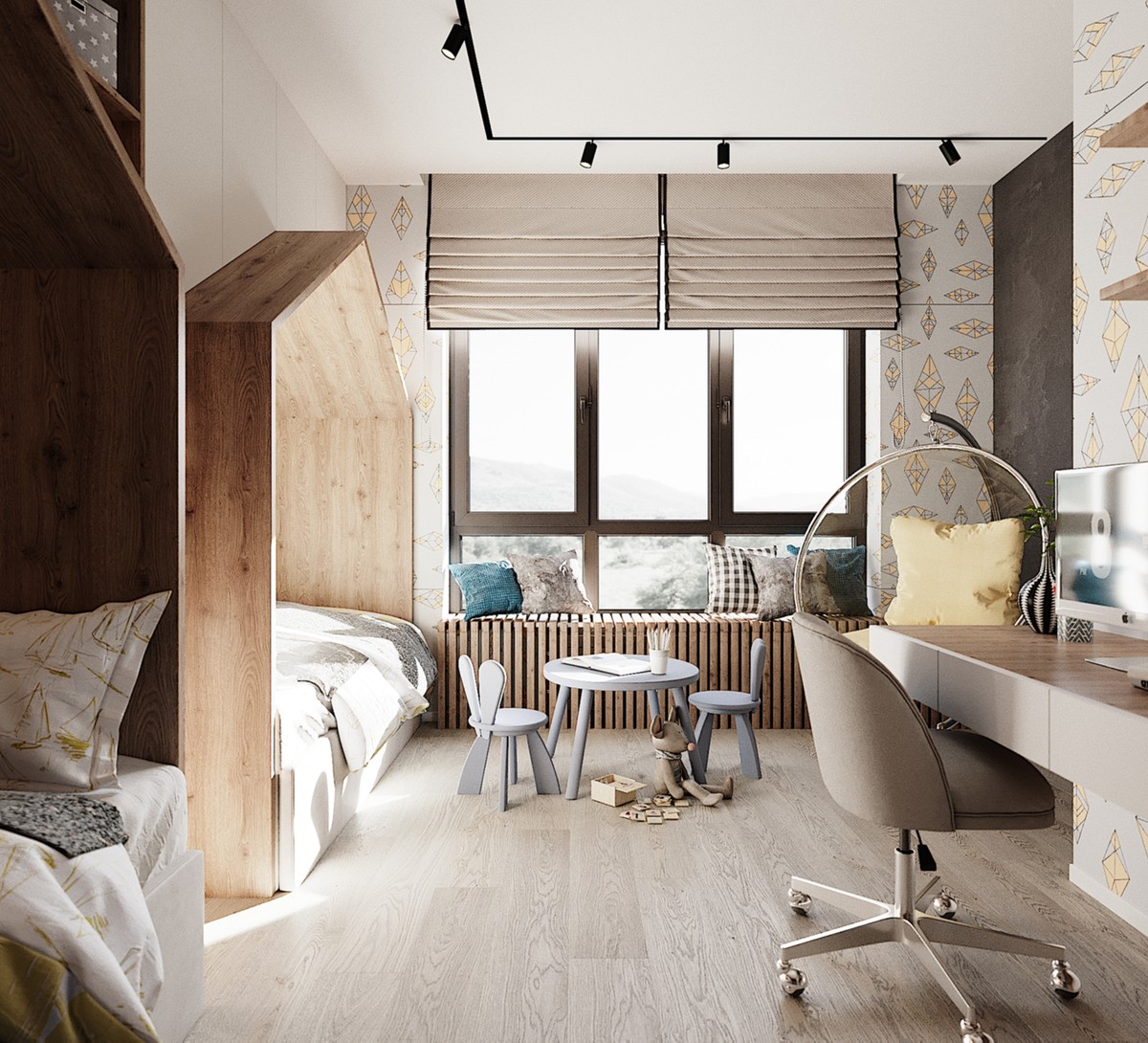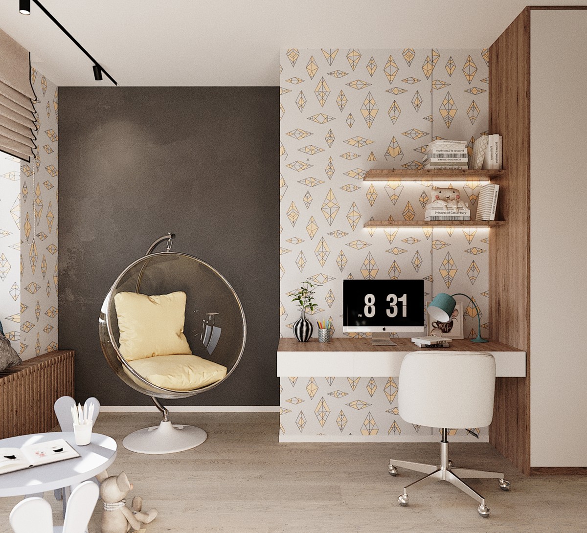 В рамках проекта было разработано несколько вариантов интерьера. Например, первоначальный вариант детской комнаты был оформлен в более светлых оттенках и имел меньше мест хранения.