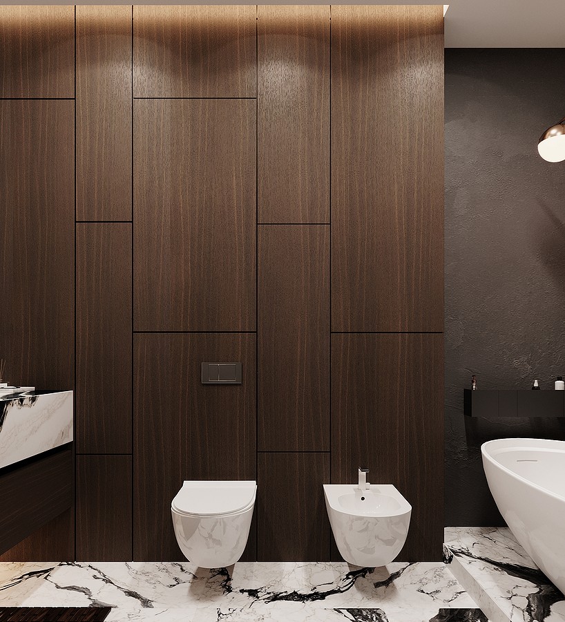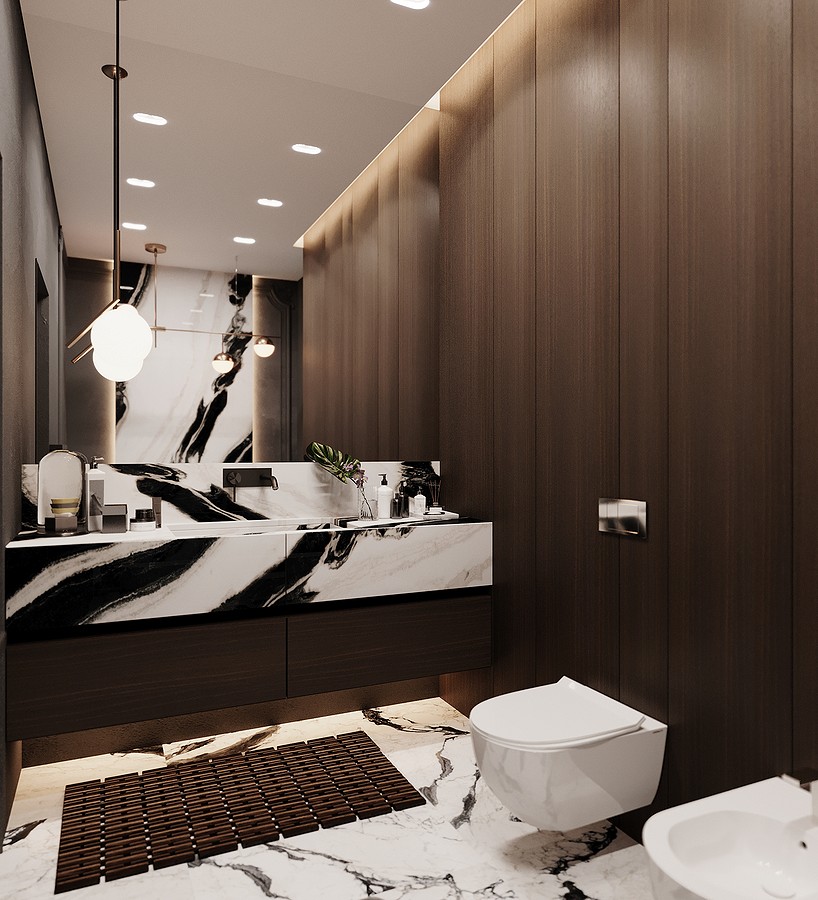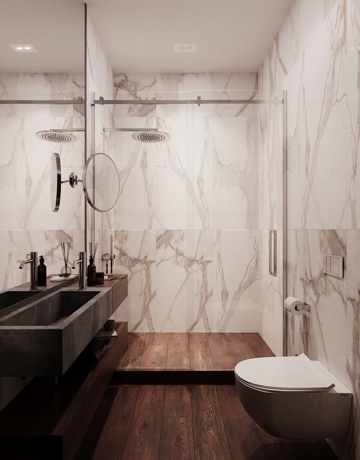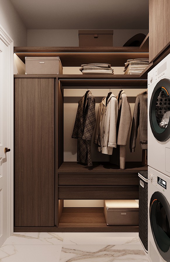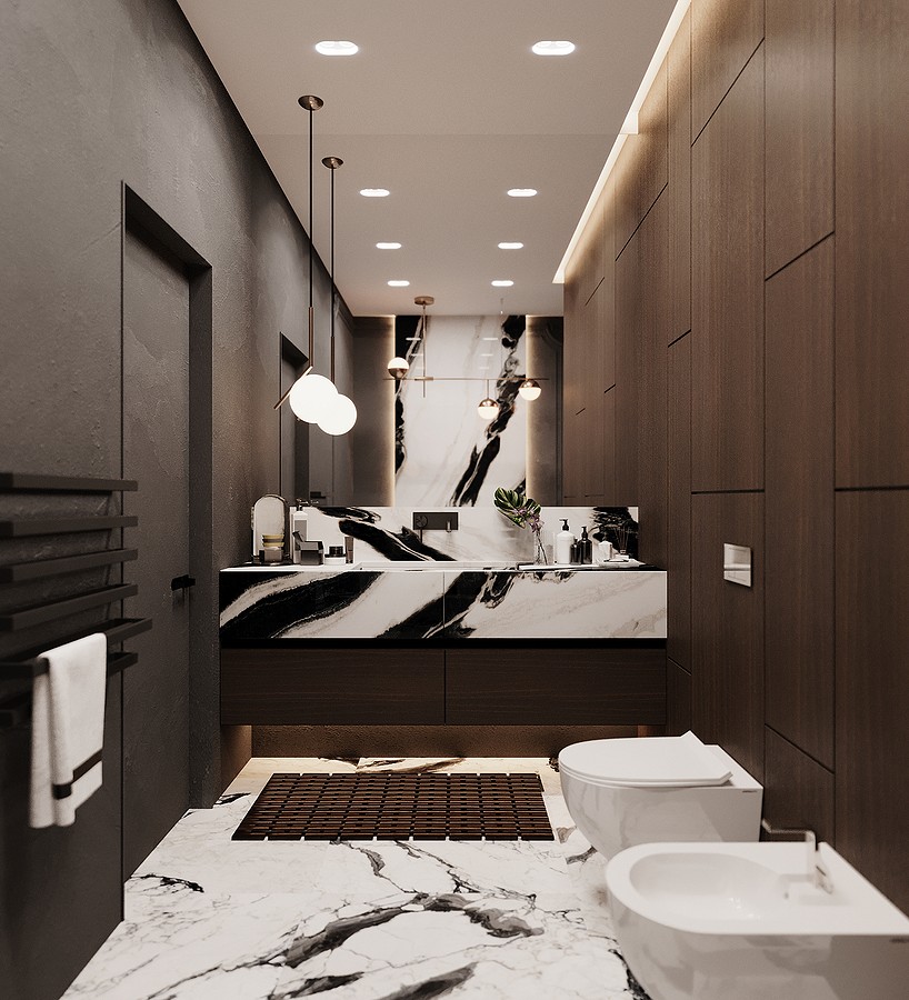 Самым интересным решением в этом проекте стала мастер-блок, который представляет собой единое приватное пространство. Оно включает спальню, гардеробную и большую ванную комнату.