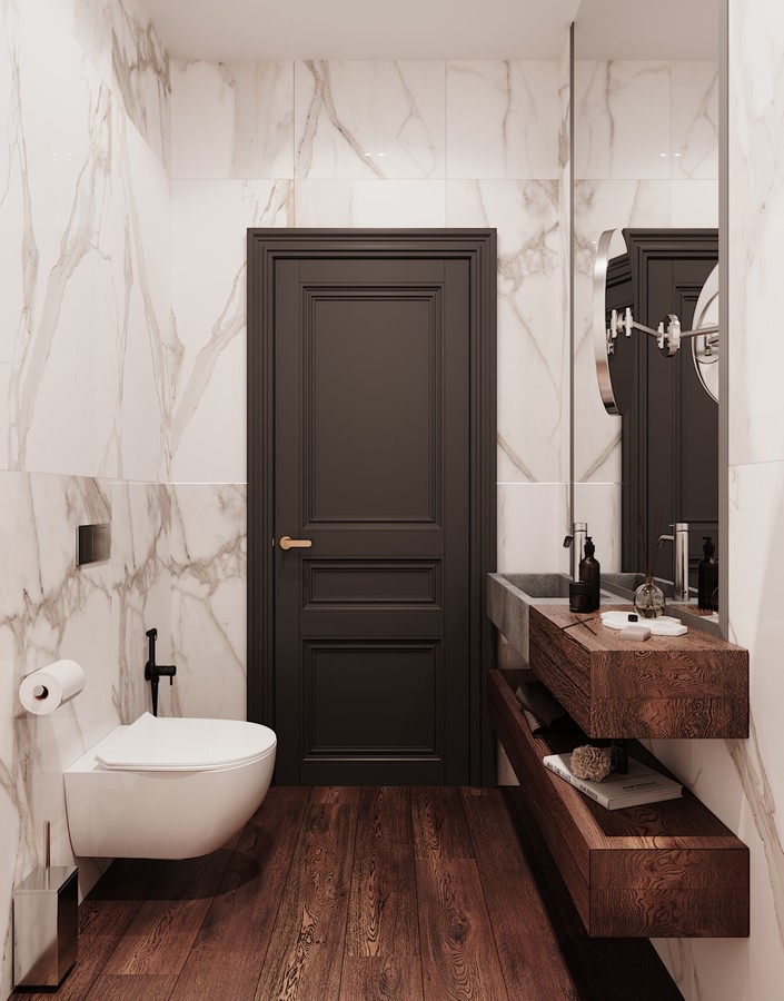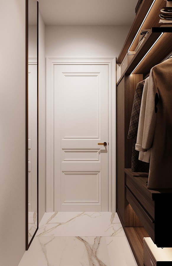 Проект этой квартиры - это современный интерьер, в котором мы объединили различные фактуры в единое целое. Деревянный паркет, шпонированные панели, мрамор, декоративные штукатурка, стеклянные и латунные вставки, гипсовая лепнина и молдинги - все органично сосуществует, не вызывая хаоса.