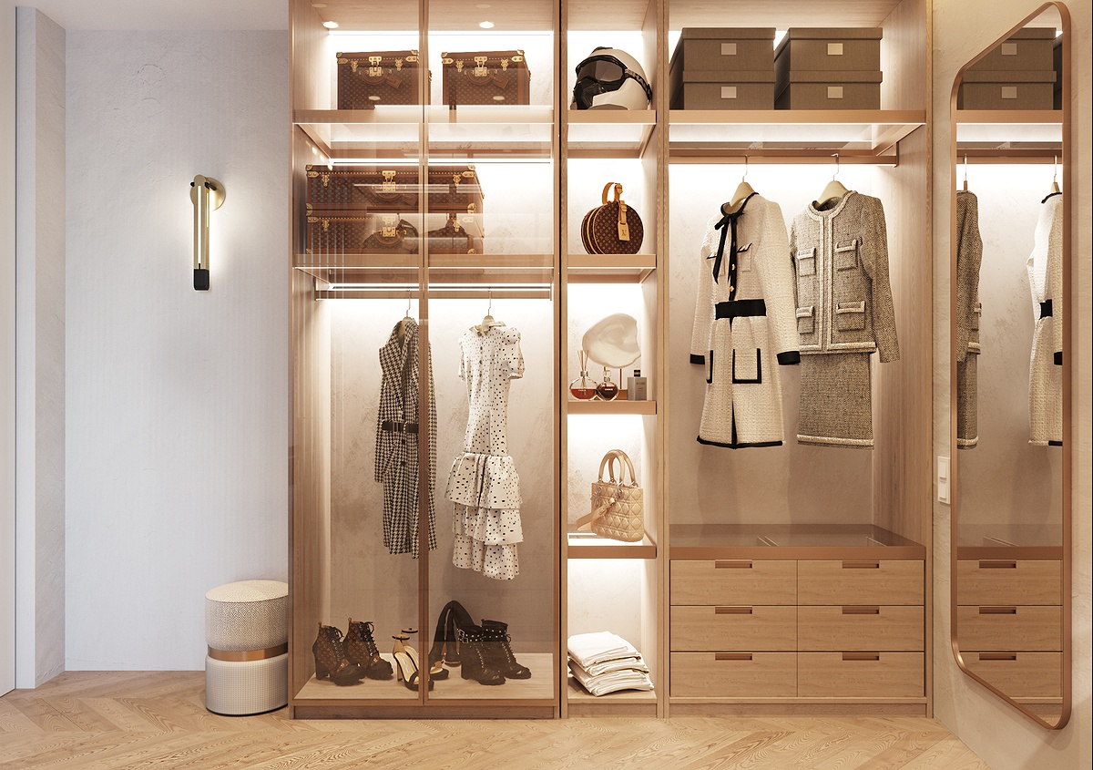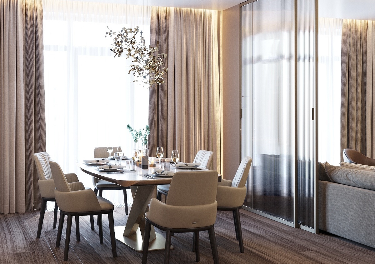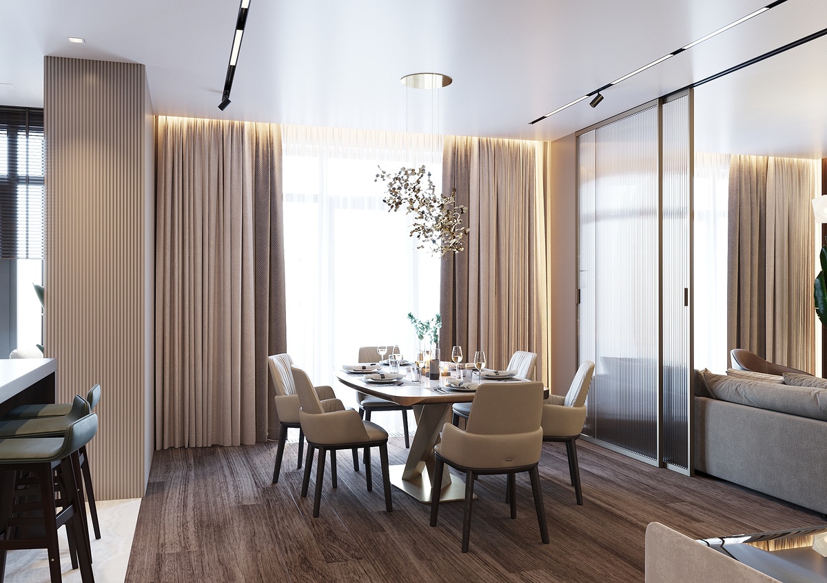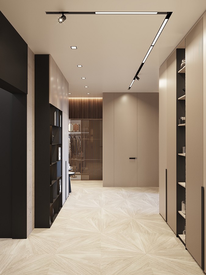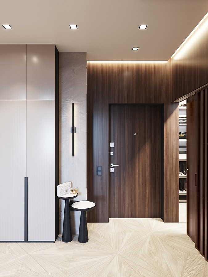 При внешней строгости интерьера, проект квартиры в ЖК "Монополист" можно описать как комфортное современное пространство со сложными фактурами и деталями. В отделке мы использовали шпонированные панели, крупноформатный керамогранит, латунные вставки, зеркала и рифленое стекло.