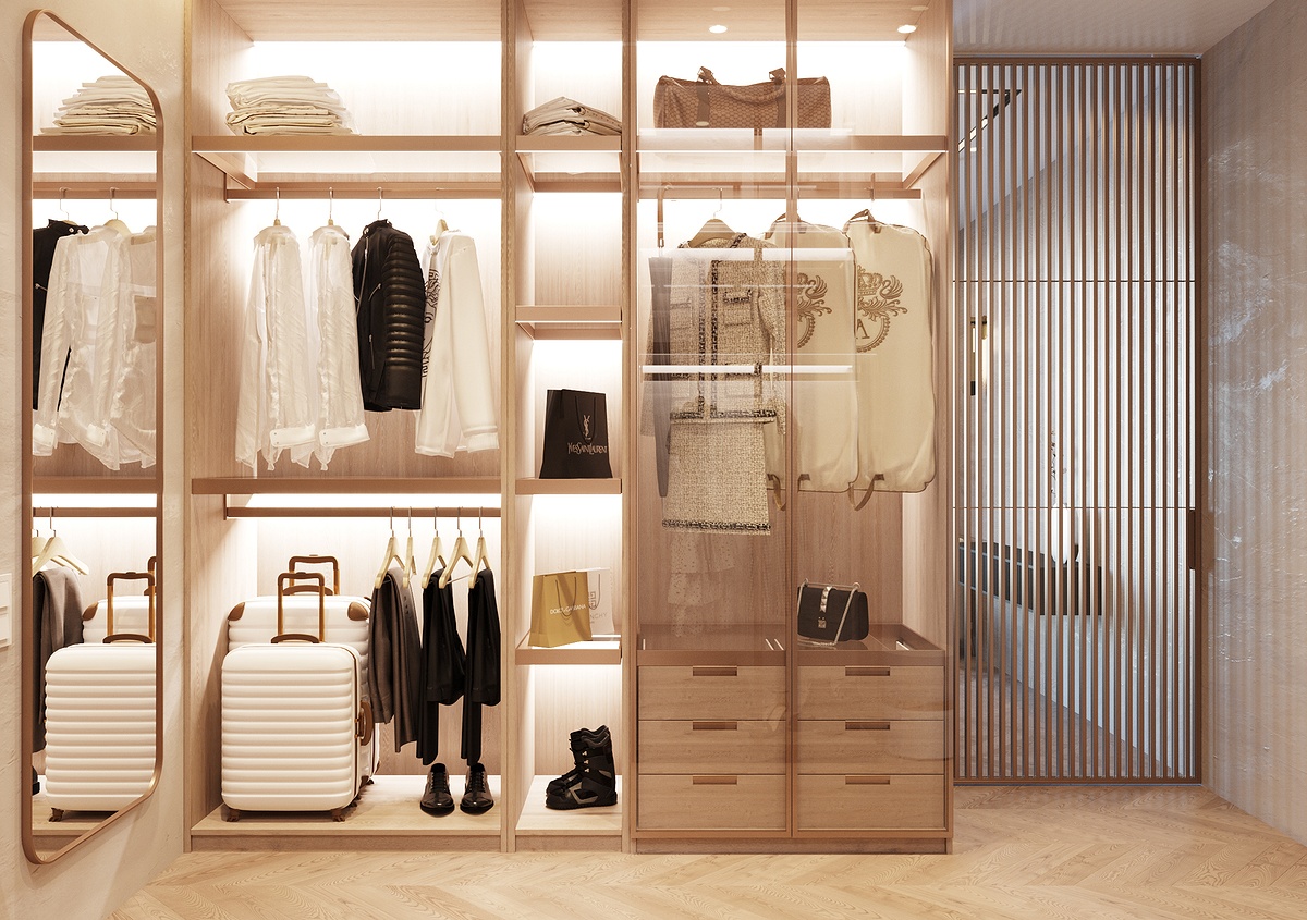 Особенности: большие окна, использование различных по фактуре материалов, спальня с открытыми гардеробом, перепланировка
