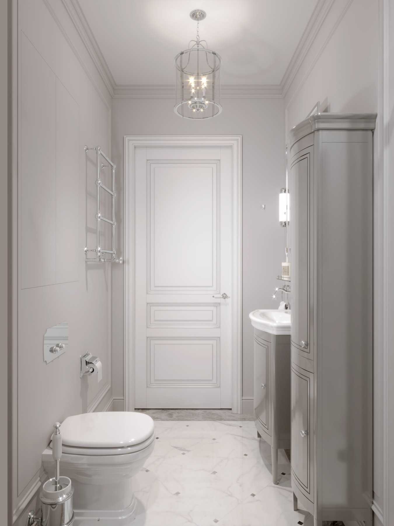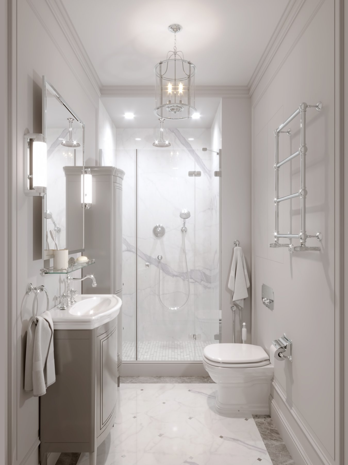 Первоначально прихожая имела совершенно другую планировку, но претерпела изменения в ходе работы над проектом. Застройщик сделал очень маленькие ванные комнаты, которые мы расширили за счет площади прихожей. Небольшое пространство в конце коридора было отдано гардеробной с высоким зеркальными дверями. Несмотря на все изменения, прихожую нельзя назвать маленькой и непропорциональной.