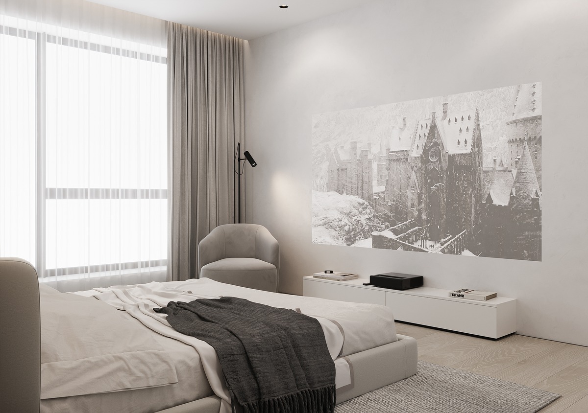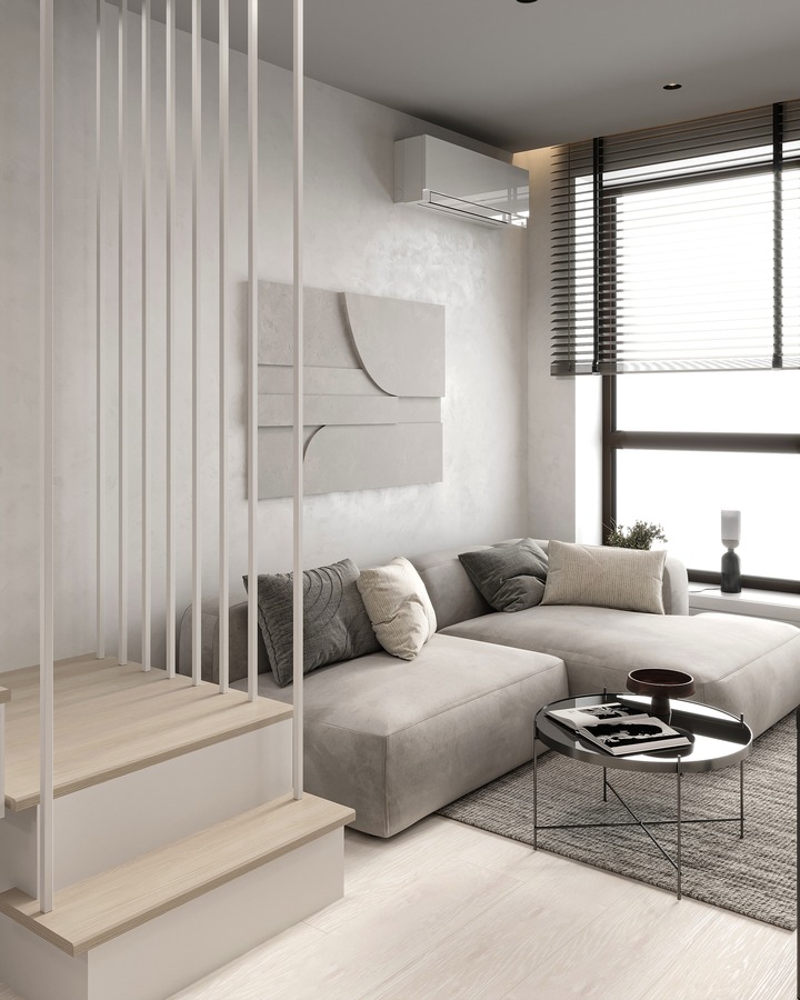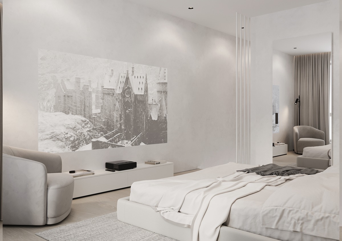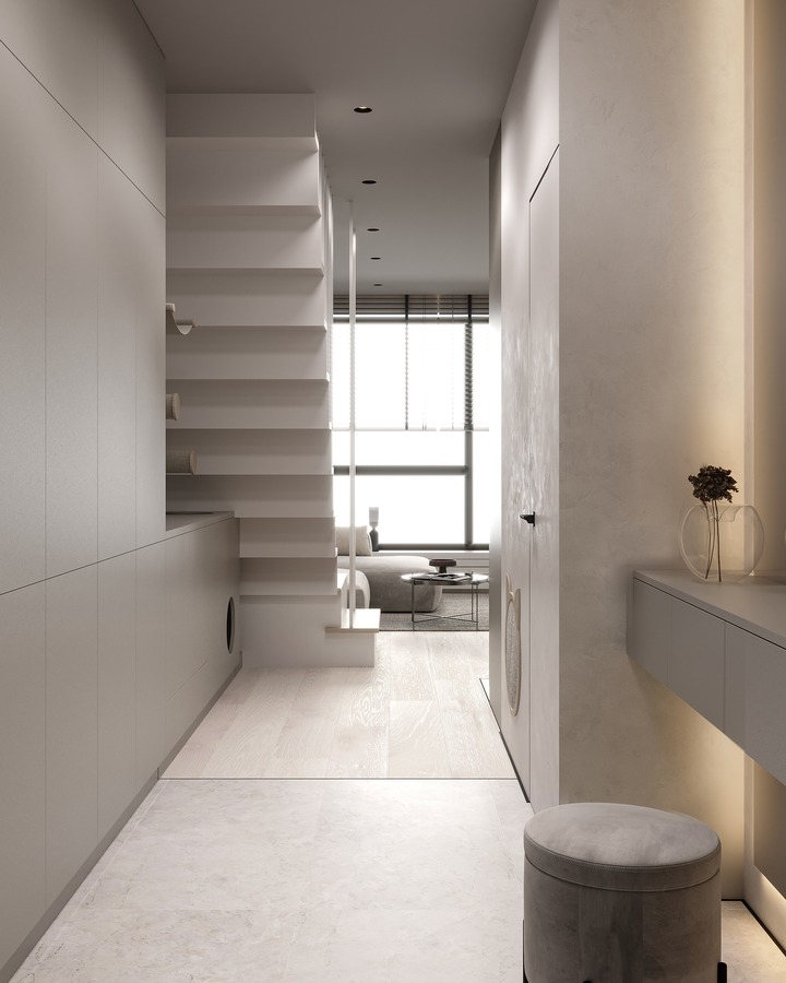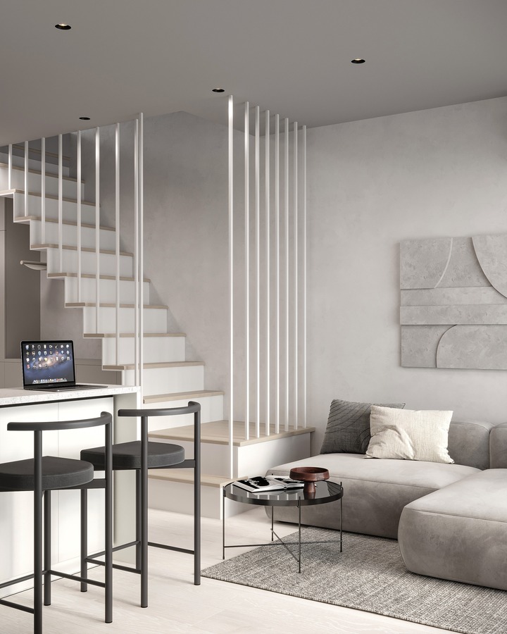Дизайн двухуровневой квартиры разработан в стиле современного минимализма с использованием белых и светло-серых оттенков. Перед дизайнером нашей студии стояла задача создать функциональное и гармоничное пространство. На первом этаже объединены гостиная и кухня: лаконичная мебель, встроенная техника и панорамные окна подчеркивают простор и свет. Второй этаж отведен под уютную спальню с мягким текстилем и практичным гардеробом. Проект сочетает легкость, эстетику и комфорт, идеально подходя для современной жизни.