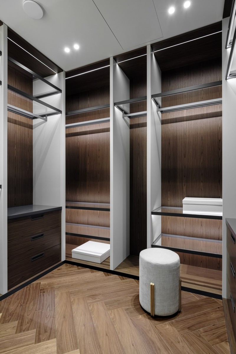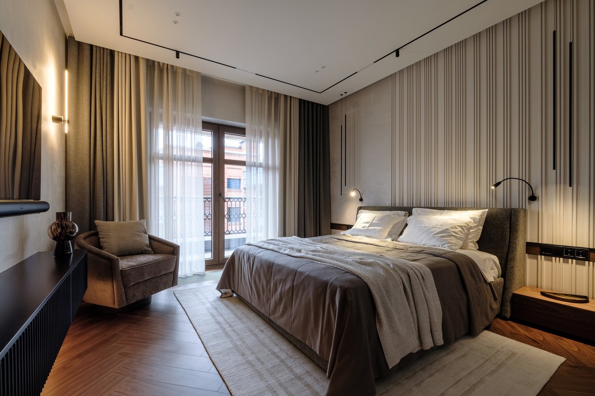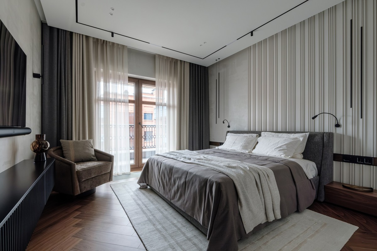 Особенности: большие окна, использование различных по фактуре материалов, спальня с открытыми гардеробом, перепланировка