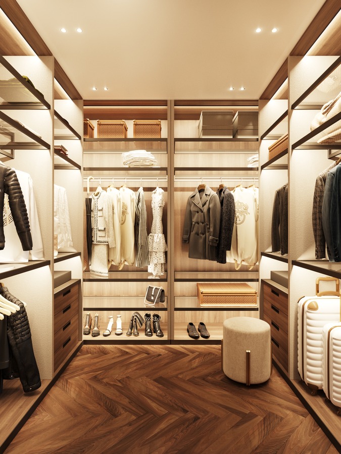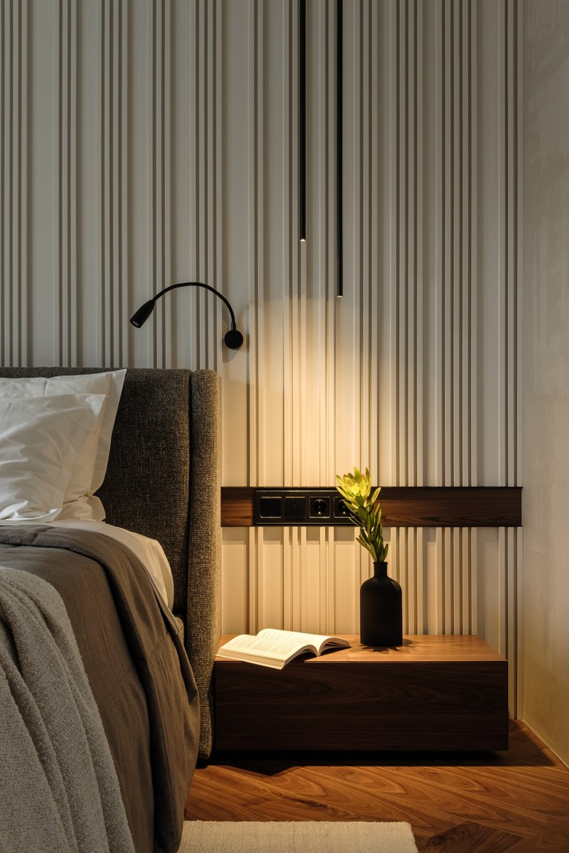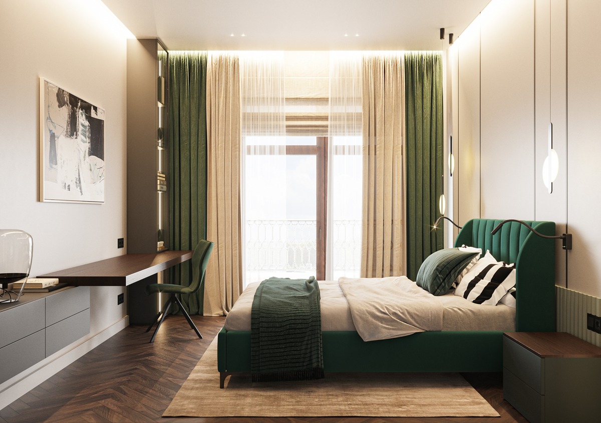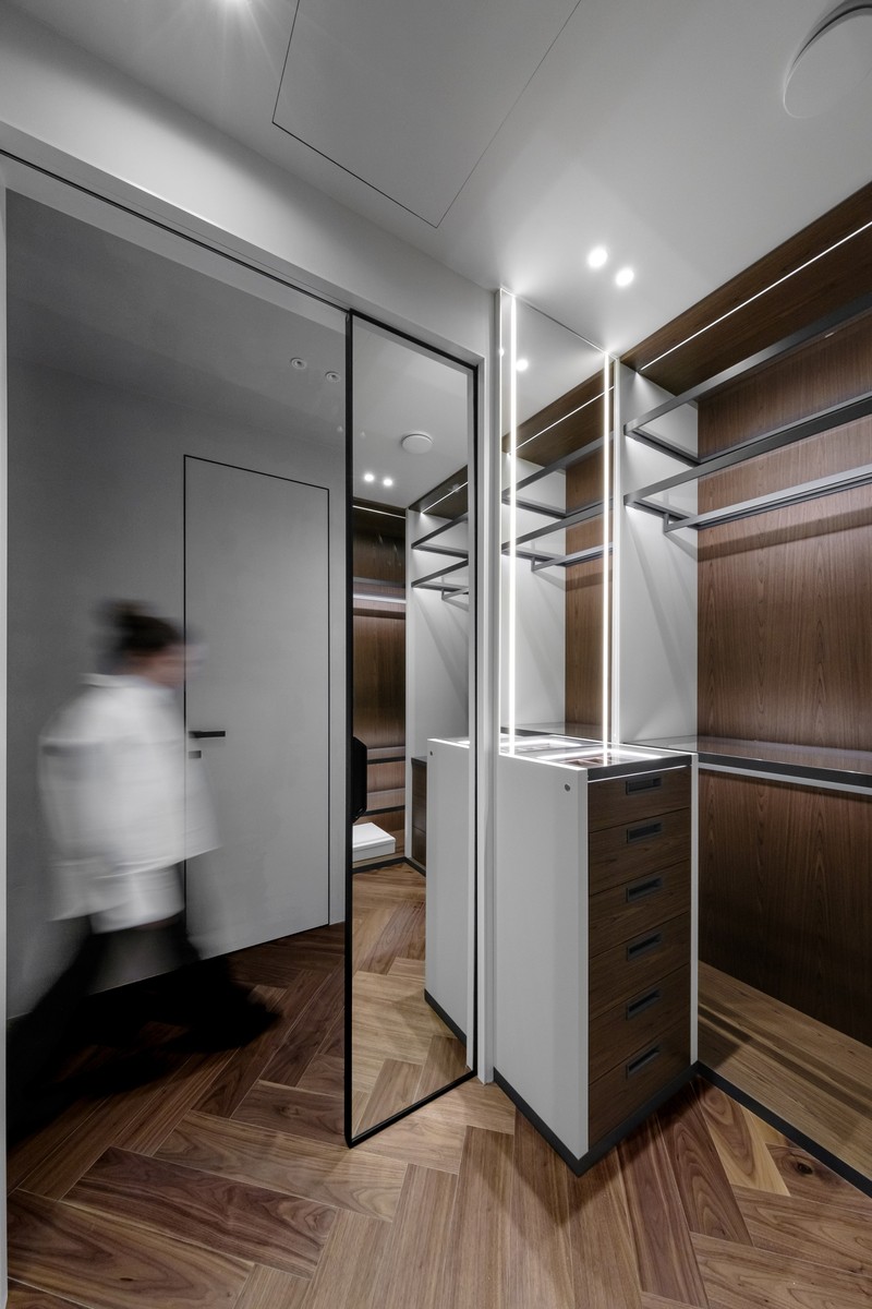 Особенности: большие окна, использование различных по фактуре материалов, спальня с открытыми гардеробом, перепланировка