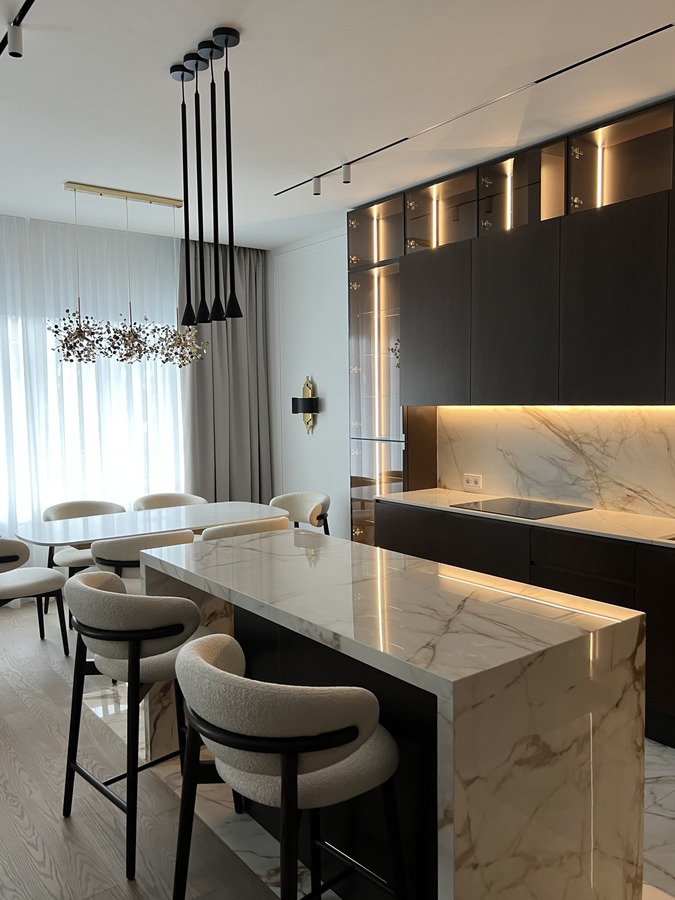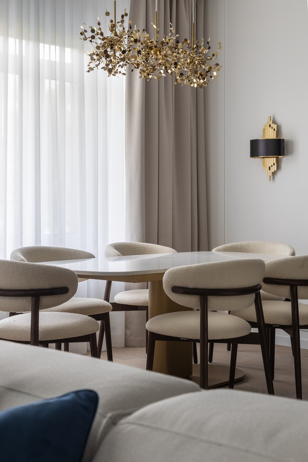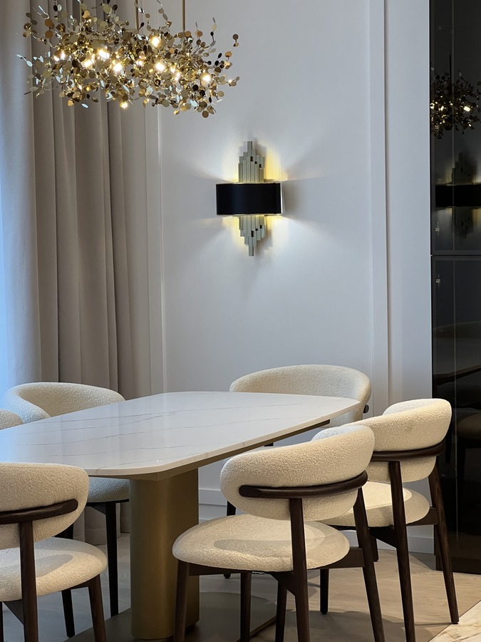 Для проекта квартиры в ЖК «Сосновка» мы нашли интересное решение — обеденную зону на 6 персон. Мы разместили большой стол с тонкой белой мраморной столешницей и латунным основанием, а также деревянные стулья со светло-бежевой обивкой. Дополняет обеденную группу элегантная люстра, которая не только освещает стол, но и задает стилистический ритм всей зоне.
