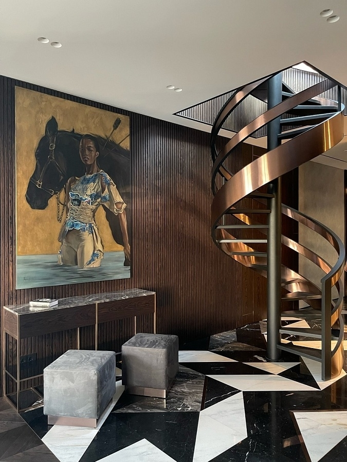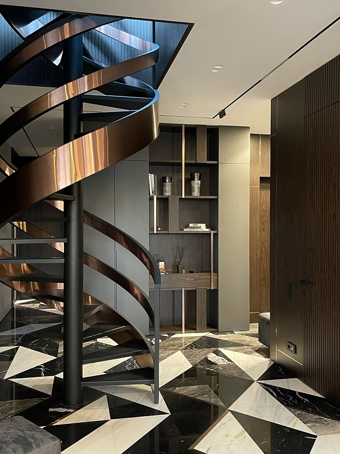 Наша студия воплотила в жизнь проект, где винтовая лестница стала не просто функциональным элементом, а главной доминантой интерьера. Её динамичная форма и сложная геометрия задают тон всему пространству, а поднимаясь вверх, мы попадаем на большую террасу — зону уединения, где городская суета сменяется тишиной и отдыхом.
