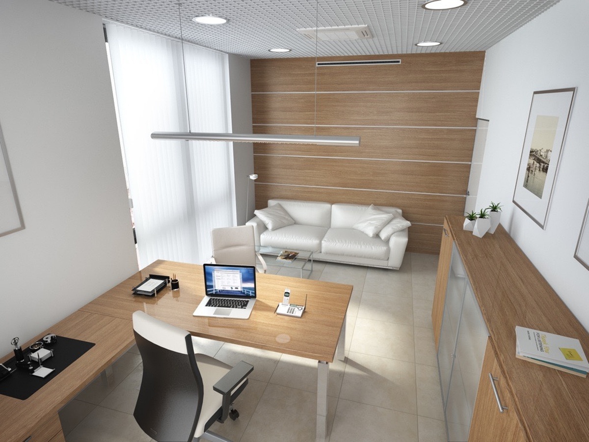 При отделке преимущественно применено классическое сочетание белого цвета и натурального дерева. Такая комбинация освежает помещение, помогает сконцентрироваться и снимает напряжение. Простые формы и линии интерьера практически не декорированы и не имеют сложных фактур, однако при всей кажущейся простоте офиса рабочие места оснащены компактным ультрасовременным оборудованием.